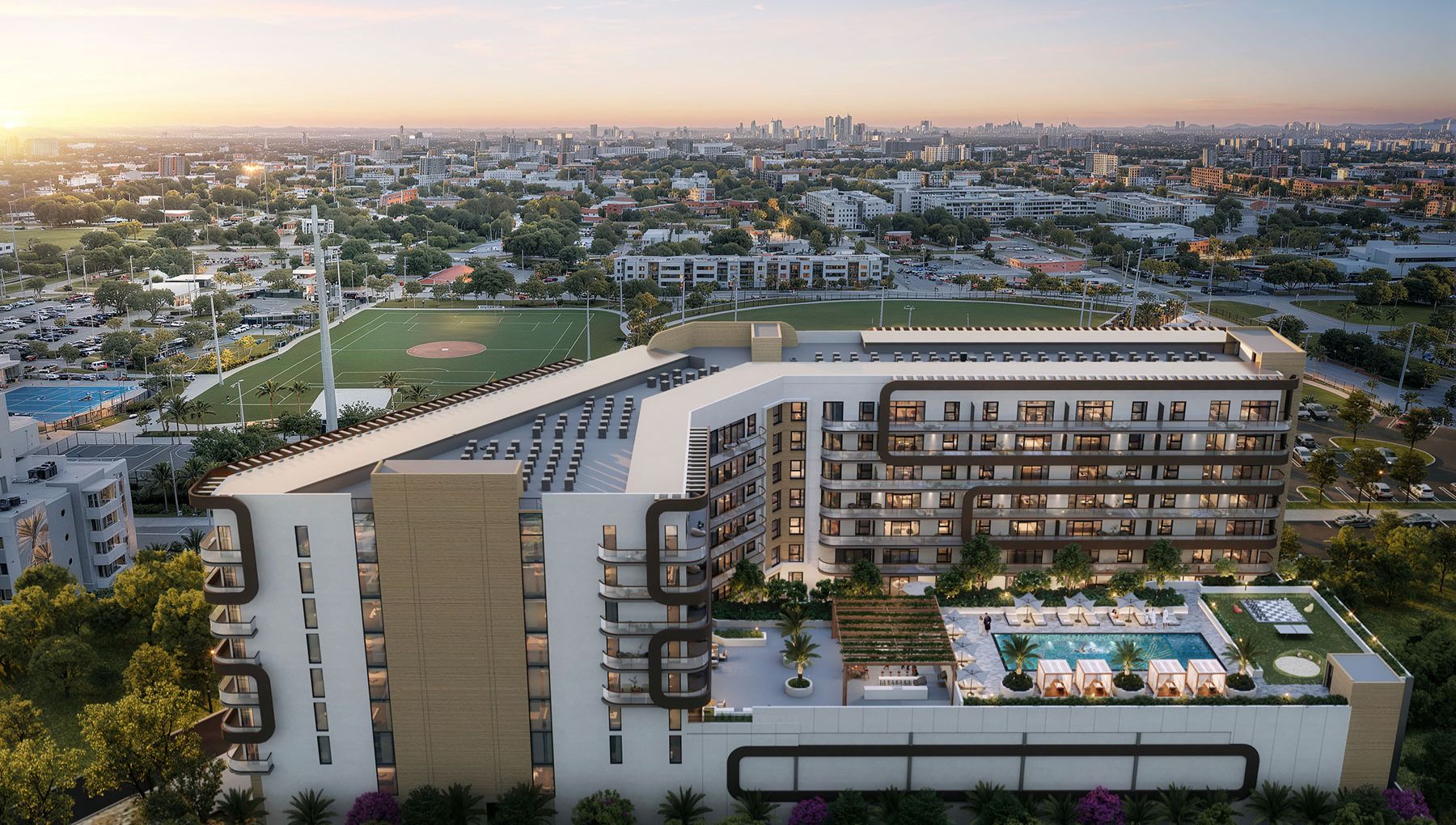Seven Park es un desarrollo residencial moderno ubicado frente al nuevo parque de USD 30 millones en Hallandale, combinando un estilo de vida urbano con una fuerte conexión con la naturaleza. Su diseño está orientado a adultos modernos que valoran la flexibilidad, la practicidad y un formato de propiedad adaptable tanto para uso permanente como vacacional. Con líneas contemporáneas, un lobby de doble altura y un entorno paisajístico exuberante, el proyecto ofrece una propuesta de vida accesible dentro de un mercado en constante crecimiento.