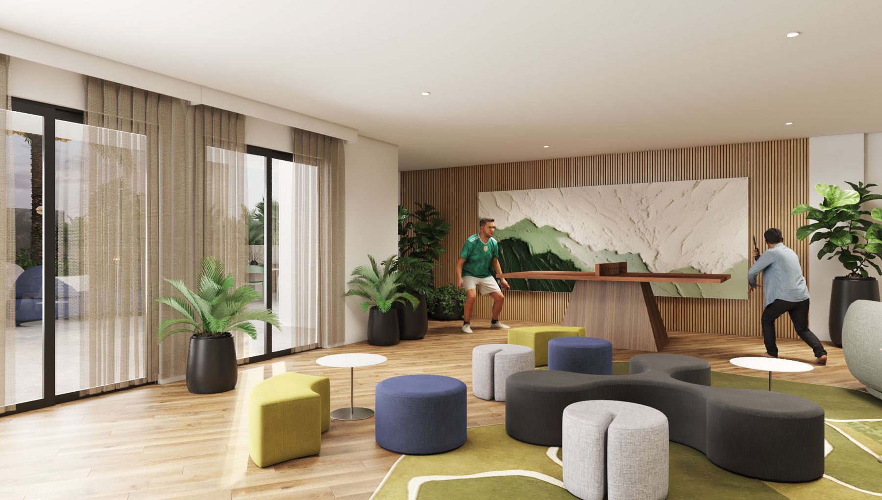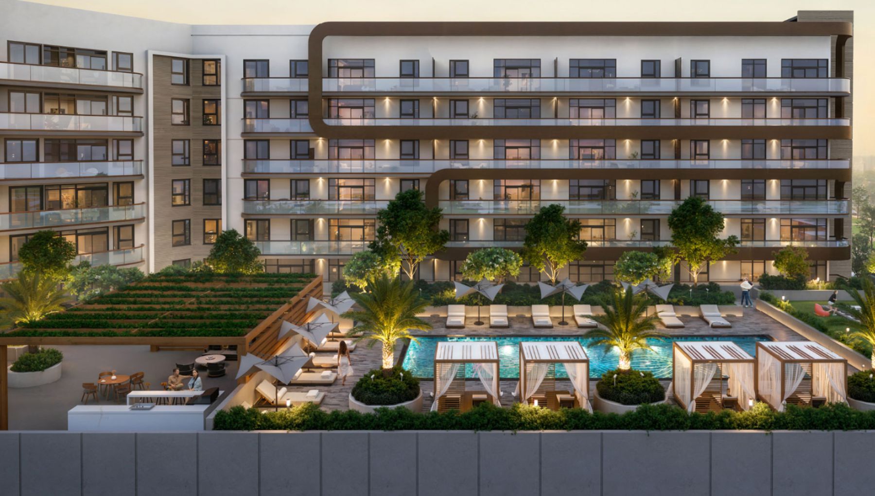 Seven Park cuenta con más de 30,000 ft² de lifestyle amenities, diseñados para fomentar bienestar, comunidad y actividades al aire libre. Entre sus espacios principales destaca una piscina estilo resort con borde limpio, dos jacuzzis, cabañas privadas y áreas de descanso rodeadas de vegetación. También incluye un centro de bienestar con duchas a vapor, sauna y cold plunge, ideales para una rutina de salud integral.